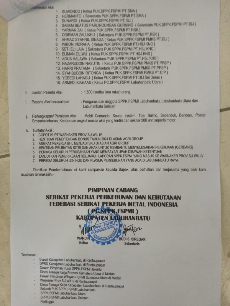 Hal tersebut diketahui tertuang dalam Surat bernomor 432/PC.SPPK.FSPMI/LBIV/2025 perihal pemberitahuan aksi unjuk rasa yang di tujukan kepada Bapak Kapolres Labuhanbatu.