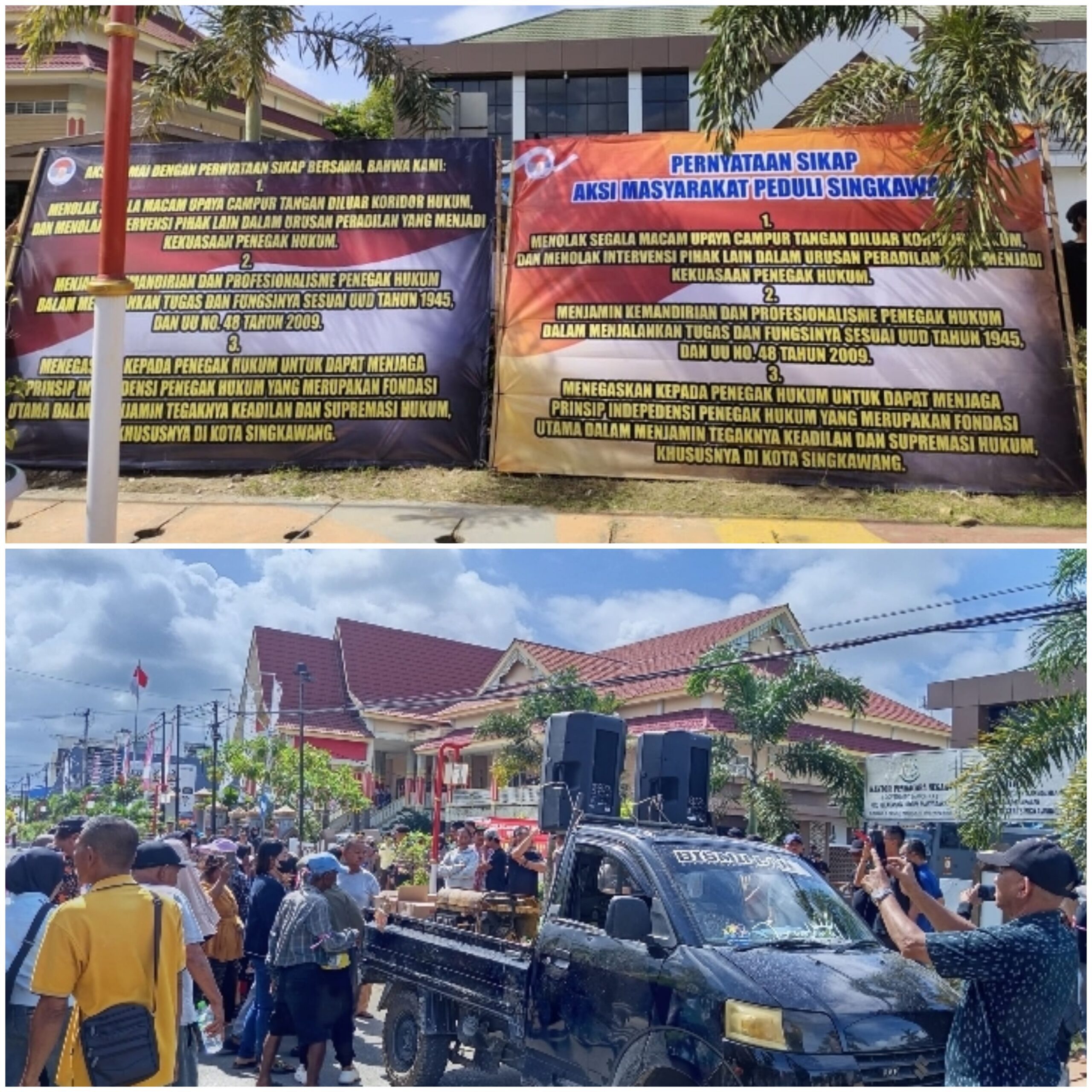 Singkawang, Bencana.co.id – Aksi damai yang digelar oleh Masyarakat Peduli Singkawang berlangsung aman, tertib, dan kondusif di depan Kantor Kejaksaan Negeri Singkawang, Jalan Firdaus, Selasa (13/1/2026).